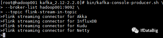 bin/kafka-console-producer.sh --broker-list hadoop001:9092 --topic flink-stream-in-topic4. 测试结果