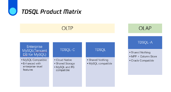 数据库是三大基础软件之一。近年来,腾讯也在不断加强各类数据库产品的研发投入。企业级分布式数据库TDSQL是腾讯云数据库的代表性产品,同时具备OLTP、OLAP,以及混合OLTP和OLAP的HTAP能力。它包括以下几个系列的产品: