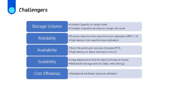 第二,当单机磁盘存储容量达到上限时,就必须将数据库实例迁移到更大的节点,这个过程非常复杂也非常耗时。从可靠性和可用性方面来说,异步复制中可能发生数据丢失。同步复制安全性更高,但延迟也更高。此外,从HA切换恢复可能需要更长的时间,从DBA的角度来看,灾备发生HA的时候,这个时间点是不可控的。