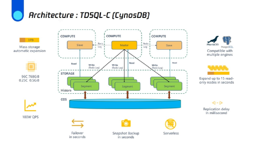 云原生数据库TDSQL-C,采用计算与存储分离架构的共享存储产品。包含两大兼容版本:即MySQL版与PostgreSQL版。
