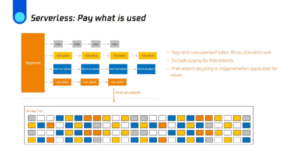 第二个功能是通过细粒度的资源统计,实现客户只需按实际使用计费,不使用不收费。过去,随着数据规模不断增加,即使之后删除数据,数据实际规模已大大缩小,但是已用空间不会减小,客户仍需要为未使用空间资源买单。为了准确计算空间使用量,我们利用三个链表分别管理不同使用状态的extent: 完全占用,部分占用和未占用。只有完全占用和部分占用的extent才会被添加到空间使用计算规则中,从而帮助客户节省成本。此外,TDSQL-C在分配空间的时候以1兆为单位进行分配,根据是否占用决定实际的计费存储量。当资源无需被使用时,我们会将其回收到资源池,以便用于其它目的。所以从用户的角度出发,降低了用户的计费存储量。后续我们还会继续优化,真正做到页级别的使用计费。