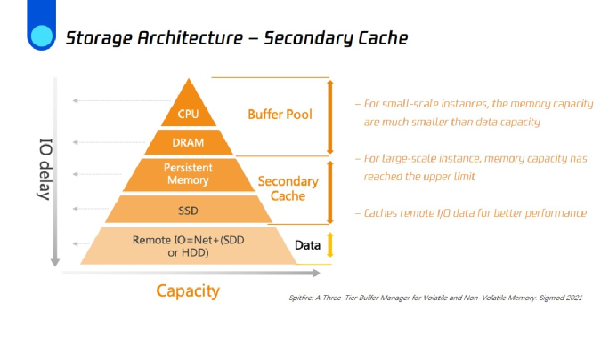 我们在存储架构中引入了一个非常重要的功能,称为二级缓存。此前,我们做了很多努力来优化读取性能和写入性能,但实际上,由计算和存储分离带来的远程I/O不容忽视。最初,存储层次结构中只有两层,其中内存始终是缓存频繁访问数据的第一优先级。当缓存未命中时, 我们必须依靠远程I/O来读取数据并缓存到buffer pool中。如果buffer pool已满,则从中选择记录淘汰并加入新读取数据。