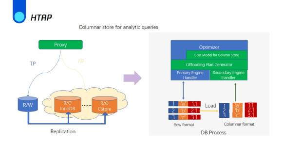 屏幕左侧是传统的解决方案,其中系统以单个R/O节点部署。查询基于行存或列存引擎中执行,完全由Proxy通过手动指定的连接字符串或一些非常简单的启发式规则来确定,在许多情况下可能会导致一些不正确的查询路线选择。该解决方案的另一个问题是整个查询必须完全在基于行或列的引擎上处理,它不能结合两种引擎的优点。