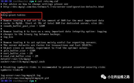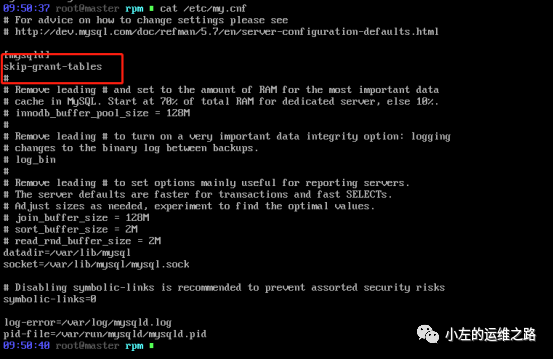 输入exit退出MySQL,停止MySQL后将skip-grant-tables从/etc/my.cnf注释掉: