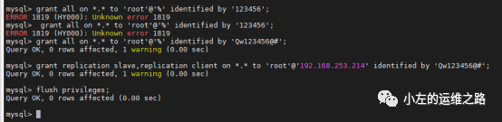 grant replication slave,replication client on *.* to 'root'@'192.168.253.214' identified by 'Qw123456@#';