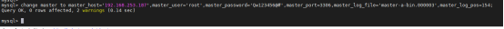 change master to master_host='192.168.253.187',master_user='root',master_password='Qw123456@#',master_port=3306,master_log_file='master-a-bin.000003',master_log_pos=154;