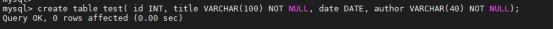 create table test( id INT, title VARCHAR(100) NOT NULL, date DATE, author VARCHAR(40) NOT NULL);