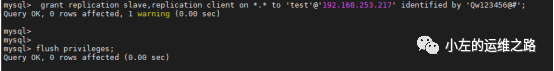 grant replication slave,replication client on *.* to 'test'@'192.168.253.217' identified by 'Qw123456@#';