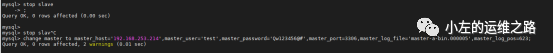 #注意:这个命令必须是在slave线程关闭的时候执行的,如果开启了slave线程,那么将会使这个命令执行失败,关闭slave线程命令:stop slave;
