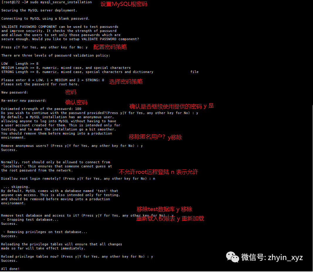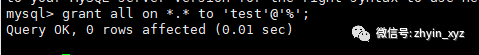 接下来终端变成了mysql>开头 然后执行下述语句开启root 任意ip 访问或者创建其他权限用户