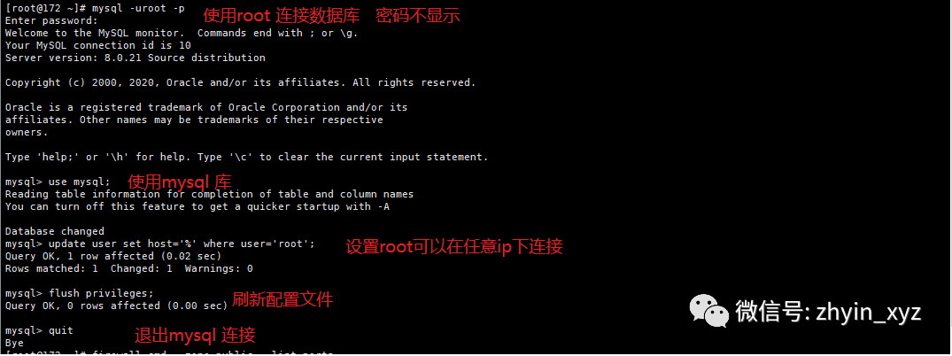 #使用 mysql库use mysql;#将root用户的host字段设为'%' 意为接受root所有IP地址的登录请求:update user set host='%' where user='root';# 立即生效flush privileges;#exit 退出Mysql连接exit