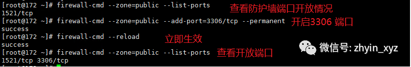firewall-cmd --zone=public --list-ports# 开启3306端口firewall-cmd --zone=public --add-port=3306/tcp --permanent# 立即生效firewall-cmd --reload