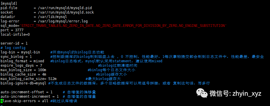 server-id = 1 # 节点ID,确保唯一# log configlog-bin = mysql-bin #开启mysql的binlog日志功能sync_binlog = 1 #控制数据库的binlog刷到磁盘上去 , 0 不控制,性能最好,1每次事物提交都会刷到日志文件中,性能最差,最安全binlog_format = mixed #binlog日志格式,mysql默认采用statement,建议使用mixedexpire_logs_days = 7 #binlog过期清理时间max_binlog_size = 100m #binlog每个日志文件大小binlog_cache_size = 4m #binlog缓存大小max_binlog_cache_size= 512m #最大binlog缓存大binlog-ignore-db=mysql #不生成日志文件的数据库,多个忽略数据库可以用逗号拼接,或者 复制这句话,写多行auto-increment-offset = 1 #自增值的偏移量auto-increment-increment = 1#自增值的自增量slave-skip-errors = all #跳过从库错误