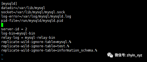 server-id = 2 # 节点ID,确保唯一log-bin=mysql-bin #开启mysql的binlog日志功能relay-log = mysql-relay-binreplicate-wild-ignore-table=mysql.% #忽略不需要同步的mysql库replicate-wild-ignore-table=test.% #忽略不需要同步的test库replicate-wild-ignore-table=information_schema.% #忽略不需要同步的information_schema库