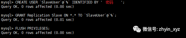 # % 表示可以在任意ip下连接 可以设置在特定ip下连接 (从库所在服务器ip)# 可以将% 替换为ip地址CREATE USER `用户名`@`%` IDENTIFIED BY '密码';# 授权 % 和创建用户的含义相同GRANT Replication Slave ON *.* TO `用户名`@`%`;# 刷新FLUSH PRIVILEGES;