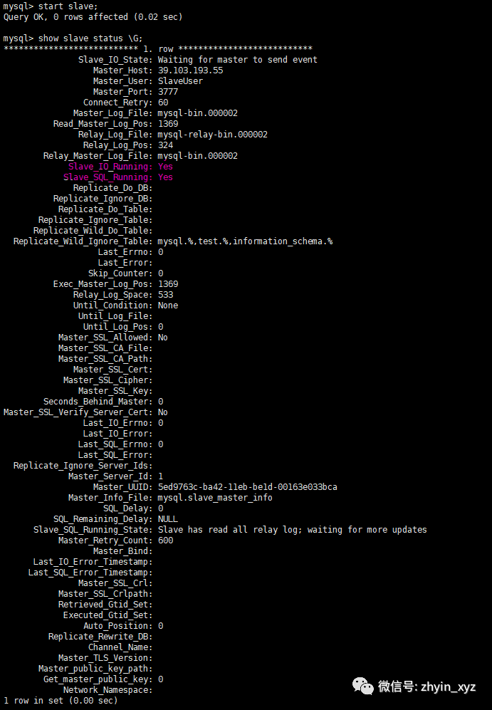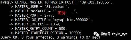 CHANGE MASTER TO MASTER_HOST = '39.103.193.55',MASTER_USER = 'SlaveUser',MASTER_PASSWORD = '密码',MASTER_PORT = 3777,MASTER_LOG_FILE = 'mysql-bin.000002',MASTER_LOG_POS = 1369,MASTER_RETRY_COUNT = 600,MASTER_HEARTBEAT_PERIOD = 10000;# MASTER_PORT 端口# MASTER_LOG_FILE='mysql-bin.000002',#与主库File 保持一致# MASTER_LOG_POS=1369 , #与主库Position 保持一致# Master_Retry_Count限制重试次数,默认3600×24=86400。# slave_net_timeout相当于主从心跳