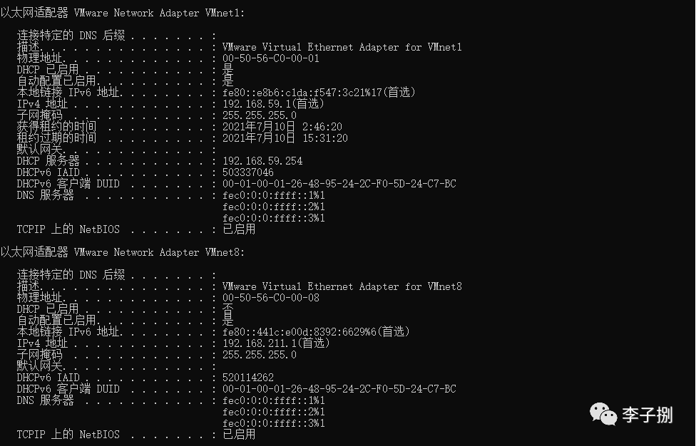 在VMware安装的宿主机查看网址信息,发现多出如下两个虚拟网卡