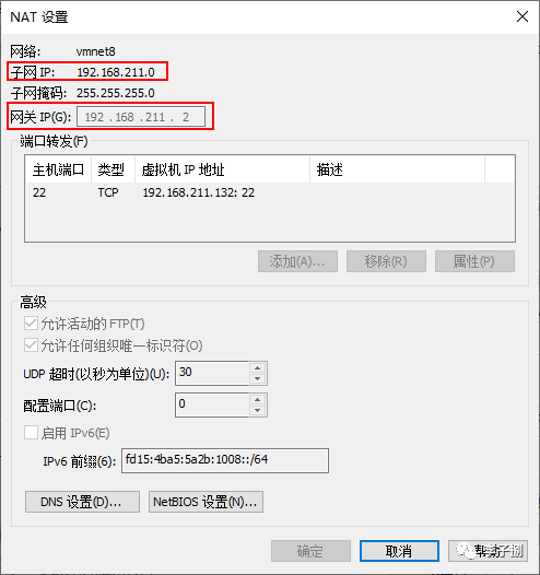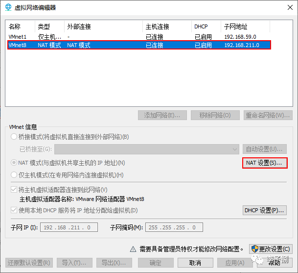 通过ipconfig -all查询到VMnet8网卡的网段为192.168.211