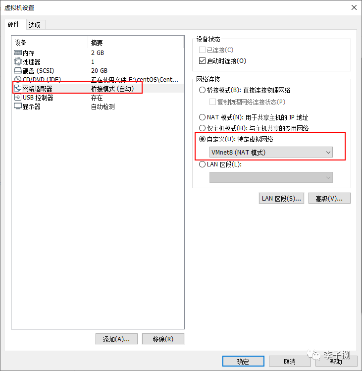 将网络是配置网络连接方式设置为自定义,并且选择VMnet8虚拟网卡,点击确定