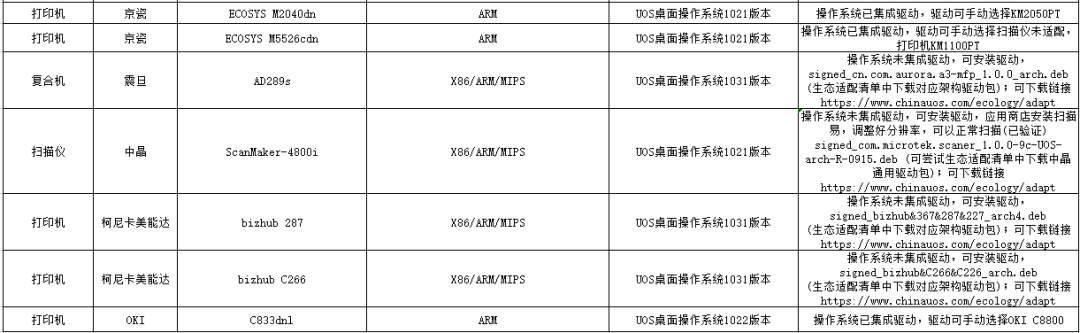 注:文中只列举部分,具体可在浙江信创公众号“综合服务”—“外设适配库”中查看。