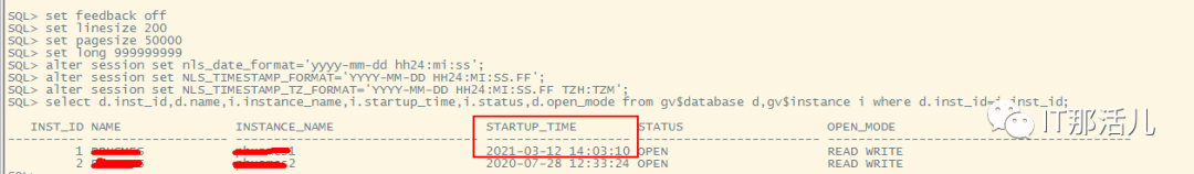 ▼▼▼set feedback offset linesize 256set pagesize 50000set long 999999999alter session set nls_date_format='yyyy-mm-dd hh24:mi:ss';alter session set NLS_TIMESTAMP_FORMAT='YYYY-MM-DD HH24:MI:SS.FF';alter session set NLS_TIMESTAMP_TZ_FORMAT='YYYY-MM-DD HH24:MI:SS.FF TZH:TZM';select d.inst_id,d.name,i.instance_name,i.startup_time,i.status,d.open_mode from gv$database d,gv$instance i where d.inst_id=i.inst_id;