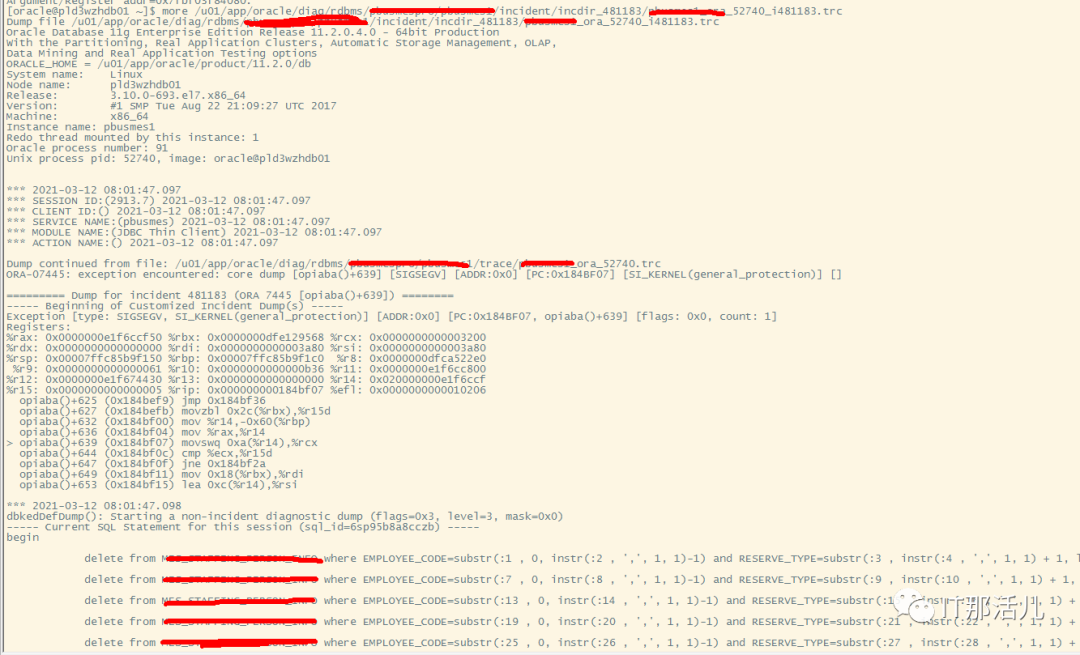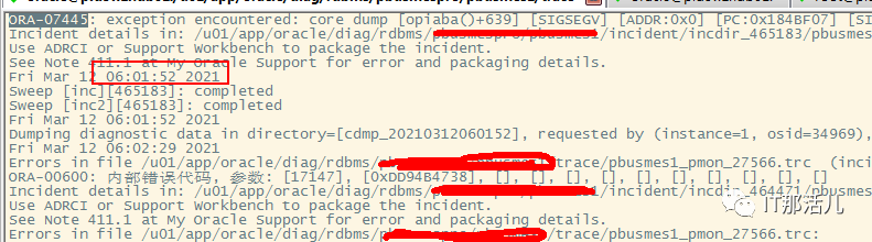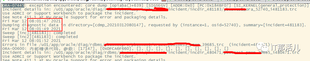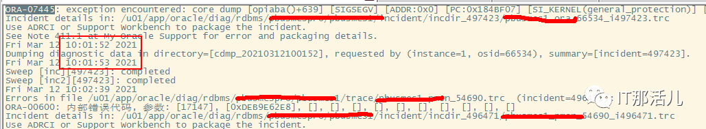查询/ORA-07445报错,核实对应时间点都有ORA-07445报错,初步猜测数据库一节点自动重启和这个报错相关,时间点刚好吻合。