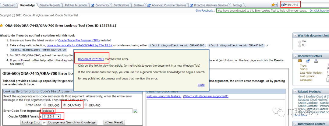 按照截图收缩可以找到对应的mos文章737378.1。核实数据库触发了 Bug 12578873