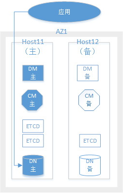 主备(一主一备)部署方案无CN,详细部署方案请参见图1,其中DN主机所在的节点为主节点,对外提供业务。主DN和备DN之间采用“最大可用”方式进行同步。