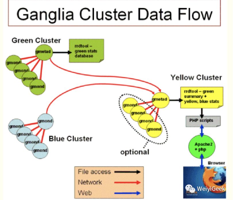 优点:部署方便,用不同分层管理上万台机器,无需逐个添加配置;ganglia服务端能通过一台客户端收集到同一个网段的所有客户端的数据;ganglia集群服务端能够通过一台服务端收集到它下属的所有客户端数据。