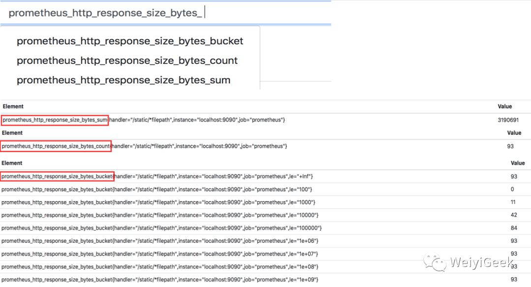 Histogram 指标: 直接反应了在不同区间内样本的个数,区间通过标签len进行定义,同时对于Histogram的指标,我们还可以
