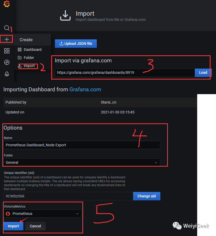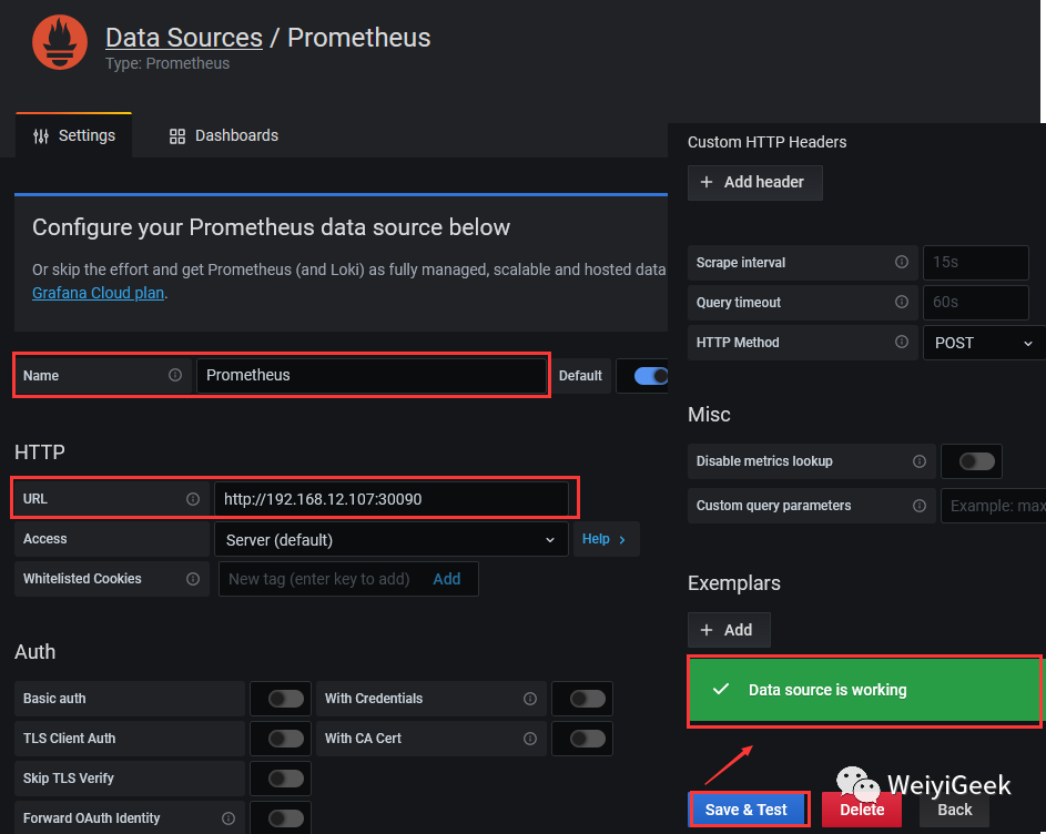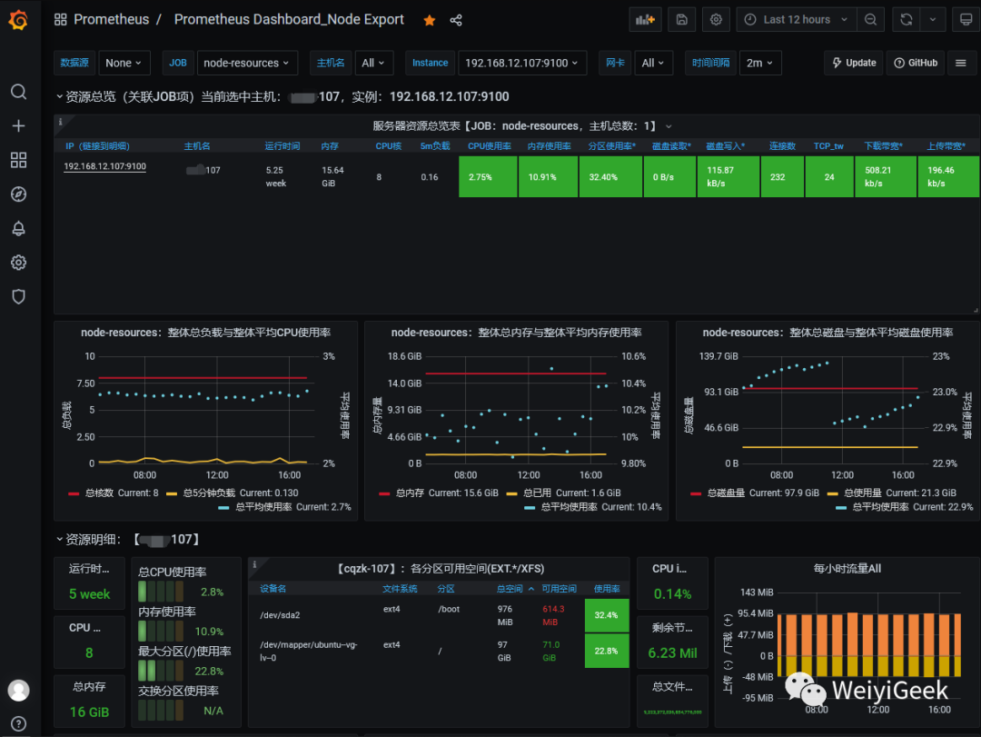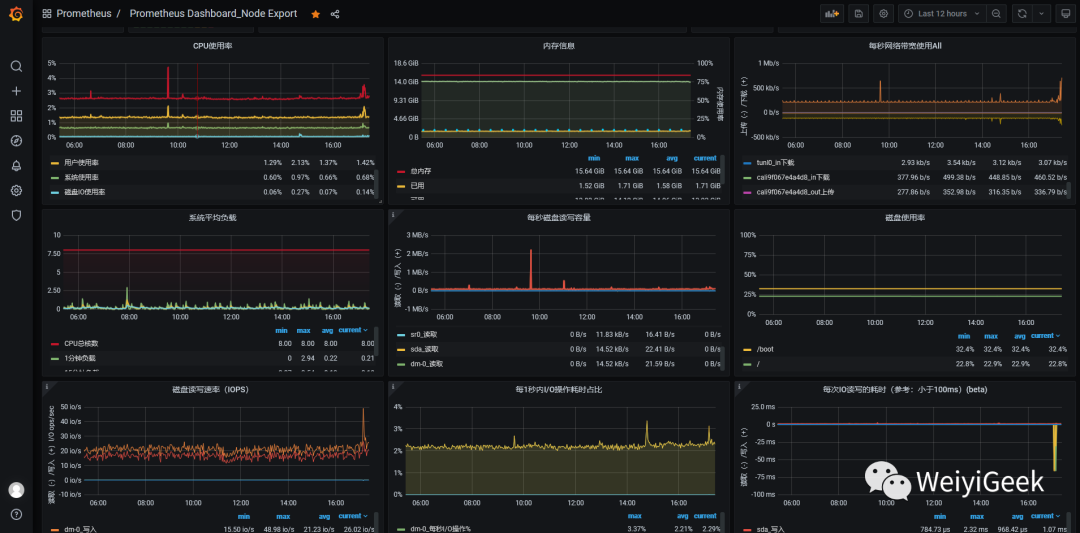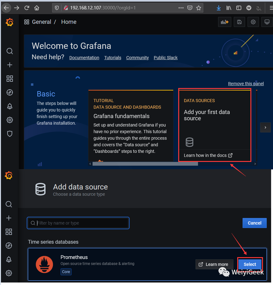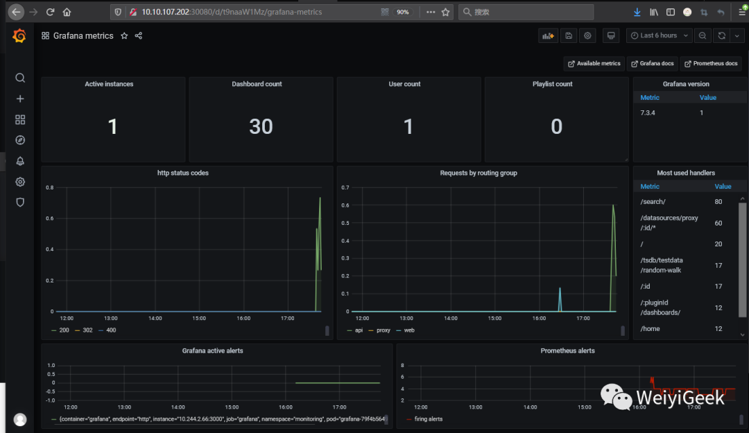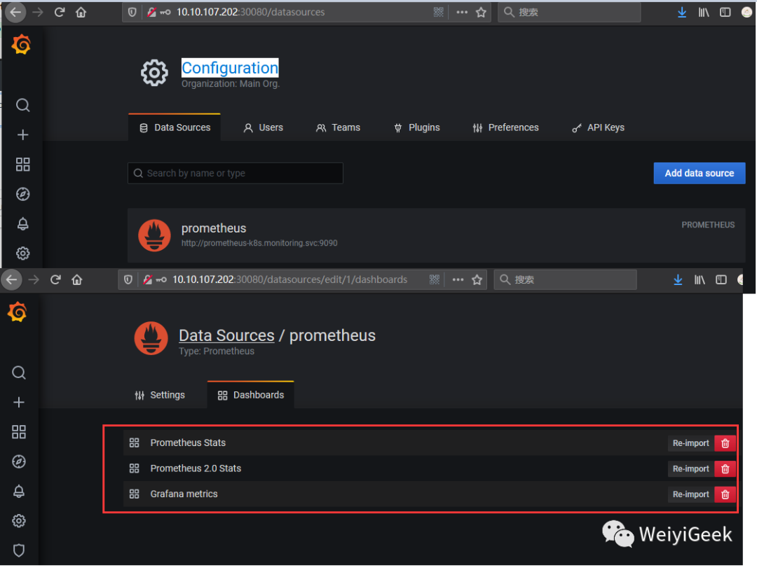 Step 6.访问grafana Web UI进行数据图形化展示,缺省账号密码admin、admin,登录后要设置新的密码weiyigeek;