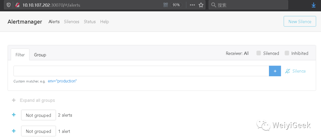 Step 7.访问 alertmanager 的 Web UI 进行查看预警;