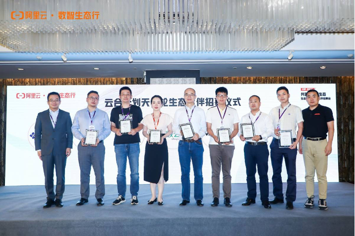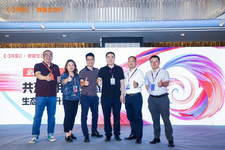 鹏博士智慧云事业部华东区直销业务总经理高杨(右3),领取了由阿里云智能销售管理与生态发展部总经理郭继军(左1)颁发的“共建应用新生态,天使轮合作伙伴证书”