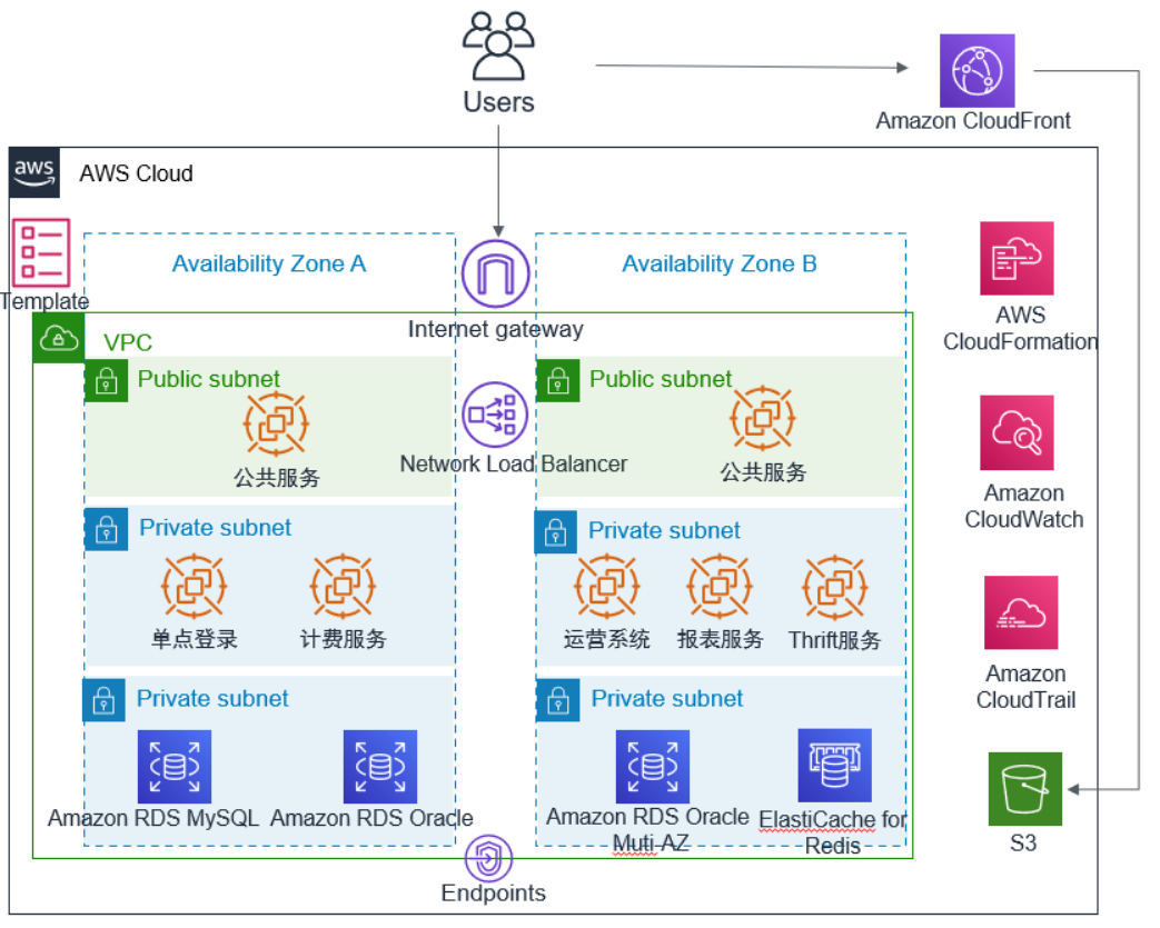 使用的AWS服务包括Amazon EC2、Auto Scaling group、Amazon S3、Amazon RDS,Amazon ElastiCache,Amazon CloudWatch等;