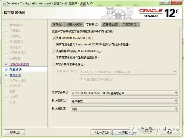 29、选择字符集,由于学习测试用,所以使用默认字符集,如果是生成环境需要跟开发人员沟通字符集的配置。