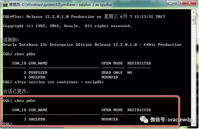 44、此时数据库连接的是CDB,show pdbs命令查看数据库下pdb状态,orclpdb是mounted状态