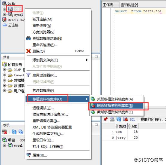 Oracle sql developer中HSDB下可以看到在数据库中能多了一个test1用户,执行查询语句也能查到数据,和上面在mysql中查到的结果一致