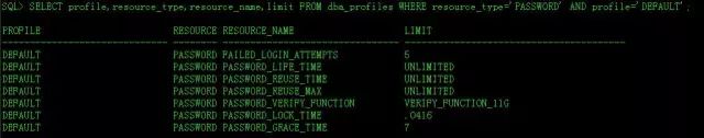 SQL>SELECT profile,resource_type,resource_name,limit FROM dba_profiles WHERE resource_type='PASSWORD' AND profile='DEFAULT';