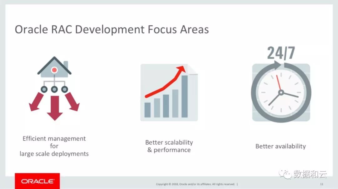 RAC 团队的产品经理总结,开发主要聚焦在三个领域:大规模部署的有效性、更好的扩展性和性能、更高的可用性。在这三个方向 RAC 在18c做出了一些显著的改变。