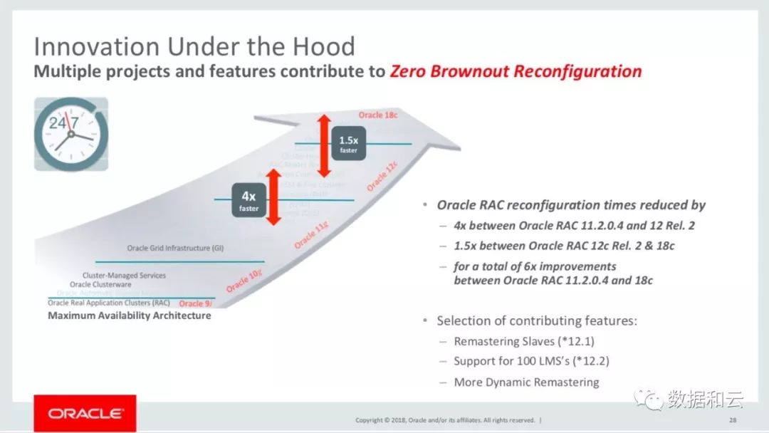 在这个方向,Oracle 突出的是,持续减小集群重配置对于可用性的影响,在12c中,较11g做出了4倍的改进,而 18c 则又做出了 1.5 的重配置增强。
