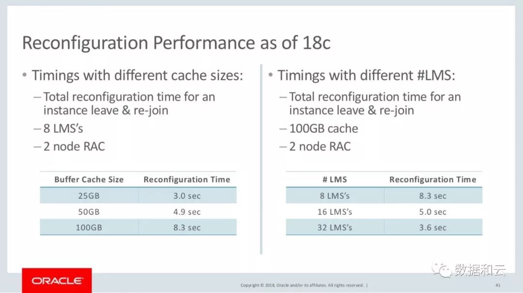 在2节点实例的测试场景中,18c 通过 8个LMS进程,在 25GB Buffer Cache下,重配置时间是 3 秒,100GB Buffer Cache的重配置时间是 8.3 秒,而在 32 个 LMS 进程配置下,重配置时间缩短到 3.6 秒: