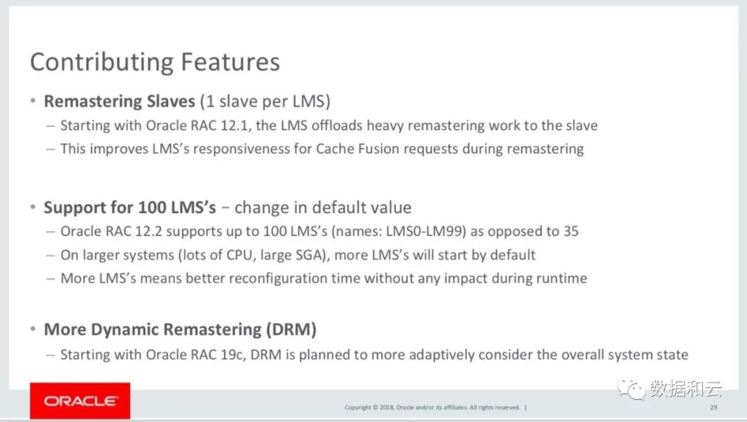 所以,其实 RAC 的改进,在不断通过多进程的并行,增加各种核心功能的速度,以下列举了 3 个主要的改进,第一个功能是 Remaster 的 Salve 进程,每个 LMS 配置一个Salve进程促进 Remaster 过程中的 Cache Fusion 速度,第二个是自12.2支持 100 个 LMS 进程,第三个是 自适应的 DRM 的改进(这是 19c 中的计划了)。