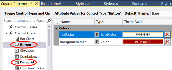 主题的使用比较简单,可以从按钮的Event事件去切换主题,也可以用JavaScript通过API函数去读取或者选择。至于每个主题要修改哪些控件的默认配置,可以手动在.theme文件中配置。理论上每个控件的每个属性都可以修改,并且修改过的控件会以加粗显示: