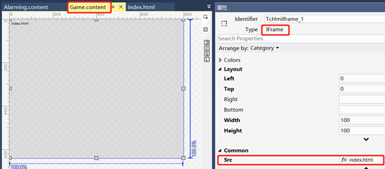 用户可以通过Iframe并指定其Source(选项Common|Src)链接到某个HTML文件来实现在Tc3 HMI的画面框架内的指定区域显示网页。例如3.1节中介绍的的导入一个网页版游戏。