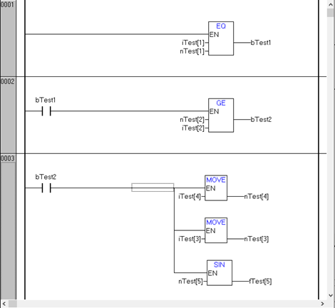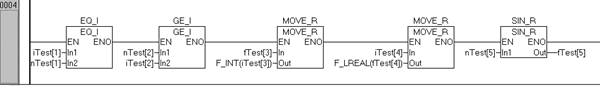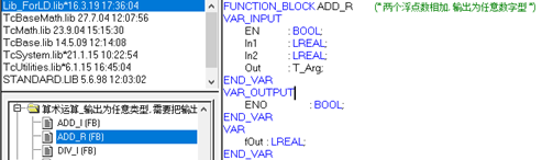 在TwinCAT 3中已经解决了这个问题,而对于长期使用TwinCAT 2的老用户还是受到这个问题的困扰。作者本人制作的库文件“Lib_ForLD”,通过把IEC运算符封装成带使能输入EN和执行输出ENO的功能块,使得在梯形图中这些FB实例可以任意串联。这些功能块包括: