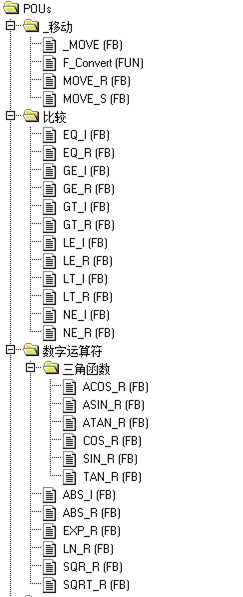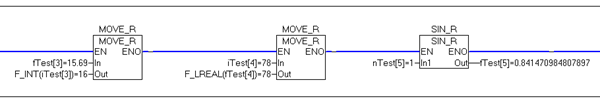 图5和图6中顺便可以观察SIN_R的使用,SIN(1)等于0.8415,SIN(2)等于0.9093。其它功能块都几乎与IEC运算符相同,望文知义,不需要逐一说明。有任何疑问,请联系作者本人。
