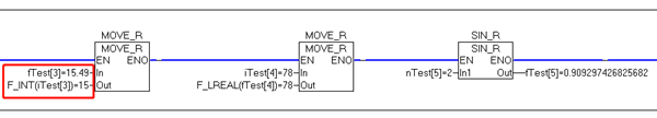图6中调用了两次MOVE_R实例,其实例名称与FB名称相同,这种用法完全将FB作为FC使用——不需要记忆,即时输出运算结果,下一次运算清除上一次的运算结果。两个MOVE_R,第1次把浮点数赋给整数,用F_INT指定输出格式,结果是四舍五入的整数。第2次把整数赋给浮点数,用F_LREAL指定输出格式,这个结果是确定的,不会有什么歧义。尝试把第1次MOVE_R的输入值从15.69改为15.49,它的输出就从16变成了15,如下图所示:
