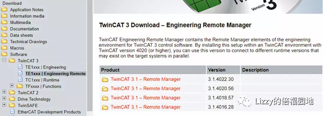 TwinCAT3 Remote Manger(简称RM)专门用于打开和编辑低版本的PLC程序。在此之前没有RM,XAE版本必须与控制器的TC Runtime版本一致。有了RM之后高版本的XAE上就可以安装若干个低版本的RM,以便对不同年代不同时期开发的TwinCAT项目进行维护。可以从Http://www.beckhoff.com下载不同版本的Remote Manger,如图所示: