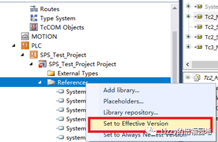 按默认设置,在TwinCAT XAE中打开任何TwinCAT项目时,所有引用的Library都会自动采用最高的Library版本去编译。但是不同工程师电脑上的Library或者同一个工程师的电脑在不同时期的Library都可能版本不同,如果一个库改用了高版本而相关的库却没找到匹配的版本,编译就有可能出错。为此,TwinCAT为Reference中的每个库提供选项“Setto Effective Version”,用于固定当前Library的版本,如图所示: