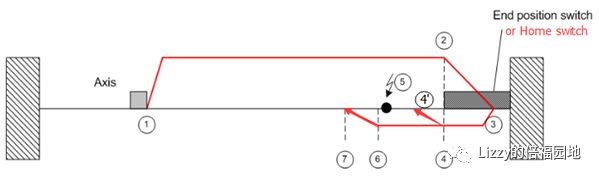 ④ 轴完全停下后开始向另一个方向运动,这个方向也是在NC中设置,推荐设置成与第一个方向相反的方向;如果使用的PLC CAM模式(默认方式),轴在反向运动回来的时候检测到原点开环信号的下降沿,在下降沿处开始减速停下;并将下降沿的位置设置为reference position;最后一般会停在0附近的位置,此时回零结束;(倘若在上一步轴运动的方向和第一次运动的方向一至,那么轴会继续朝负向运动,去碰原点开关的最右位置的下降沿,并将该下降沿设置为0点,这样设置很容易导致碰到负限位!)